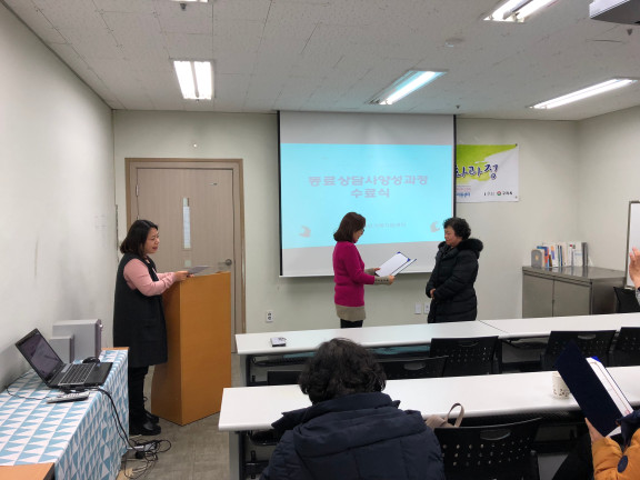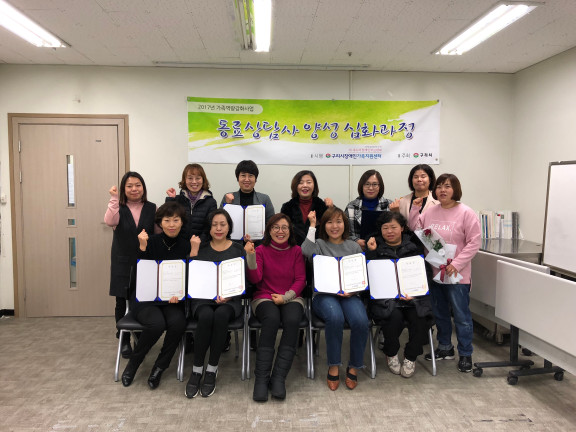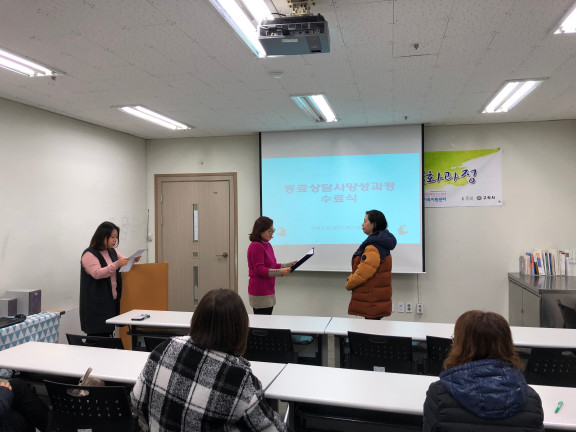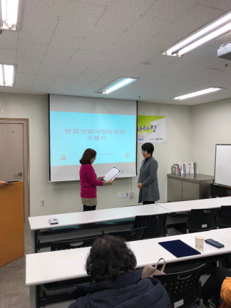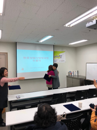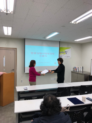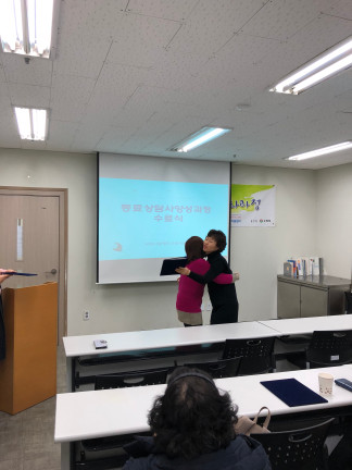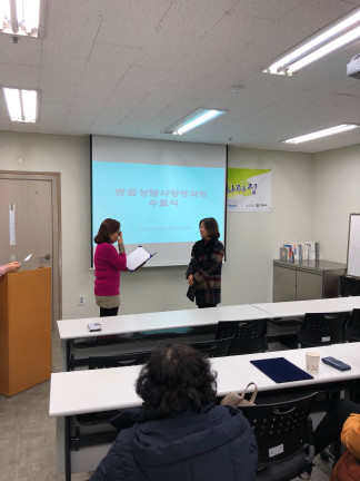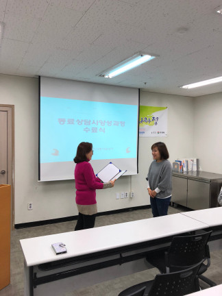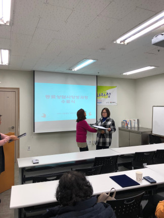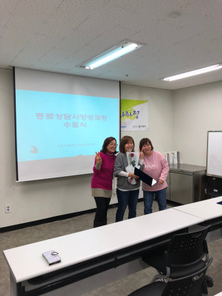 동료상담사 심화과정 12주차(목) 수료식 페이지 정보 작성자 김아롬 댓글 0건 조회 1,618회 작성일 17-12-08 00:20 목록 본문 페이스북 공유 트위터 공유 구글+ 공유 이전글동료상담사 자조모임 협동조합 <이야기가 있는 사람들> 방문 17.12.08 다음글부모교실 토탈공예 8주차 (월) : 토탈공예 17.12.06