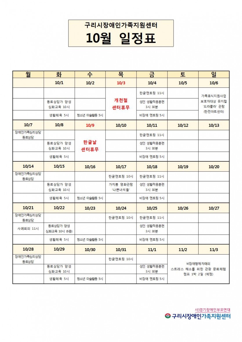 10월 센터 일정표 페이지 정보 작성자 관리자 댓글 0건 조회 7,763회 작성일 19-09-27 00:18 목록 본문 페이스북 공유 트위터 공유 구글+ 공유 10월 센터 일정표 입니다. 많은 관심과 참여부탁드립니다.^^ 이전글센터 휴무일 공지(10/3, 9) 19.09.27 다음글센터 휴무일 공지(9/12~13) 19.09.10 댓글 0 댓글목록 등록된 댓글이 없습니다.