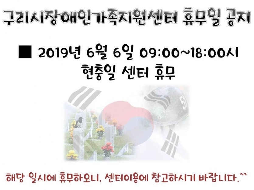 센터 휴무일 공지(6/6) 페이지 정보 작성자 관리자 댓글 0건 조회 7,017회 작성일 19-06-03 00:18 목록 본문 페이스북 공유 트위터 공유 구글+ 공유 6/7 09시에 업무 시작합니다. 이전글7월 센터일정표 19.07.01 다음글6월 센터일정표 19.06.03 댓글 0 댓글목록 등록된 댓글이 없습니다.