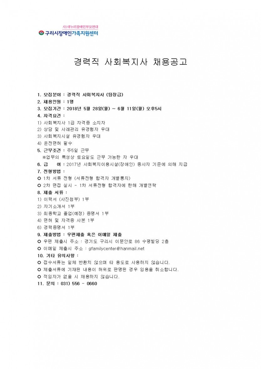 경력직 사회복지사 채용 페이지 정보 작성자 관리자 댓글 0건 조회 7,917회 작성일 18-05-30 00:18 목록 본문 페이스북 공유 트위터 공유 구글+ 공유 이전글6월 배리어프리 영화관람 안내 18.06.04 다음글사회복지사 채용공고 18.05.11 댓글 0 댓글목록 등록된 댓글이 없습니다.