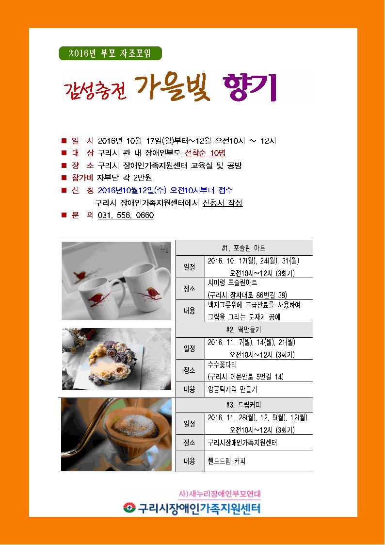2016년 부모 자조모임 감성충전 가을빛 향기 (사진 첨부) 페이지 정보 작성자 김용기 댓글 0건 조회 7,851회 작성일 16-10-11 00:18 목록 본문 페이스북 공유 트위터 공유 구글+ 공유 이전글발달장애인 자립생활준비 체험홈 프로그램 모집안내 16.12.09 다음글발달장애부모 힐링 백일장 어머니, 나르샤 공고 16.09.28 댓글 0 댓글목록 등록된 댓글이 없습니다.