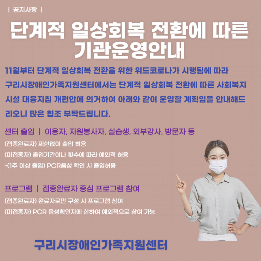 2021년 11월 단계적 일상회복 전환을 위한 위드코로나 시행에 따른 기관 운영 안내